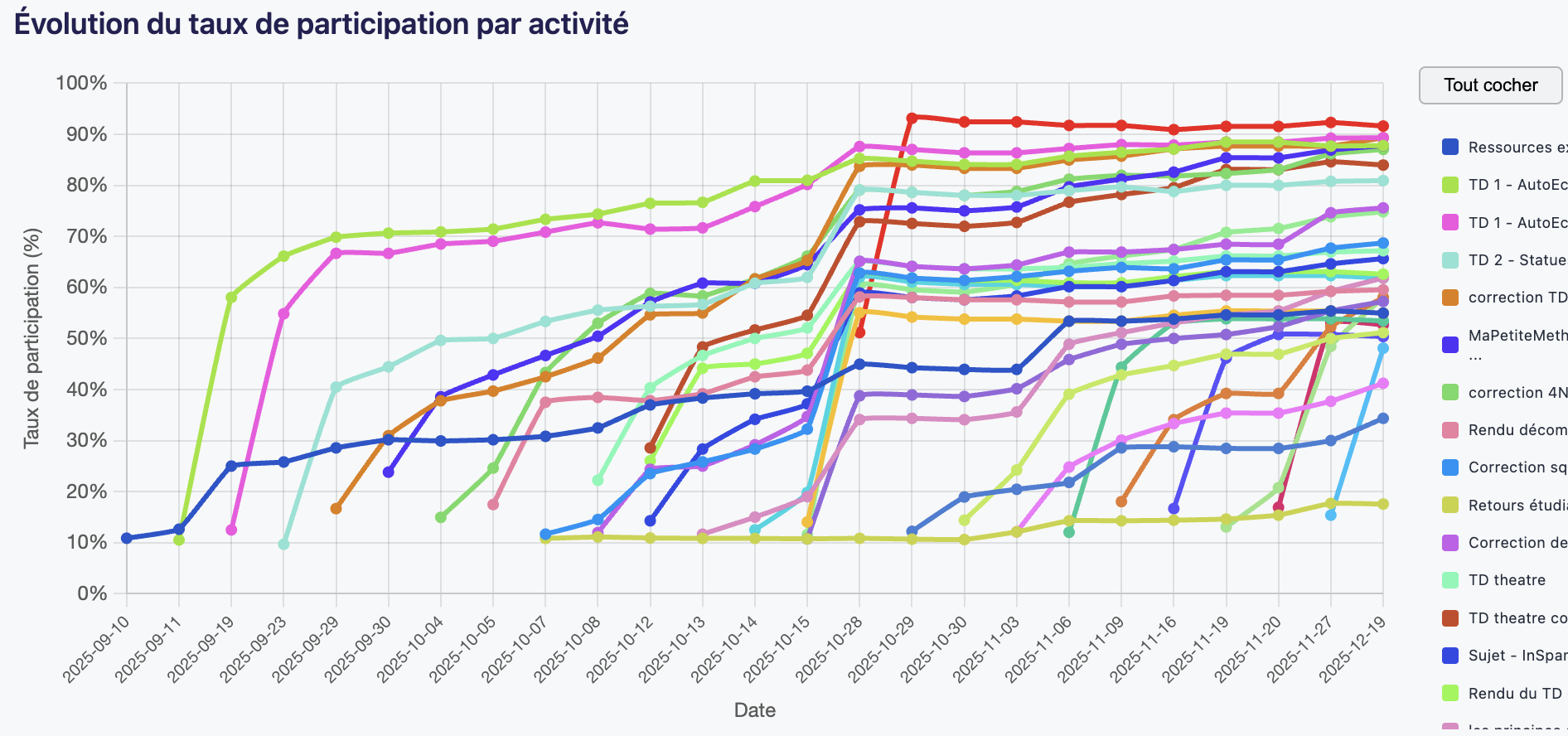 Cette figure indique la date d'activation et l'évolution du taux d'activation de chacune des activités et ressources du cours. Ce graphique permet à l'enseignant de s'assurer que les étudiants s'approprient bien, en temps et en heure, les activités et ressources qu'il met en place dans son espace de cours. En abscisse, les dates correspondent aux dates d'activation de chaque ressource ou action, l'échelle n'est donc pas linéaire. Un nouveau point est ajouté uniquement lorsqu'une nouvelle action est activée par les étudiants (au moins 10% de la cohorte).