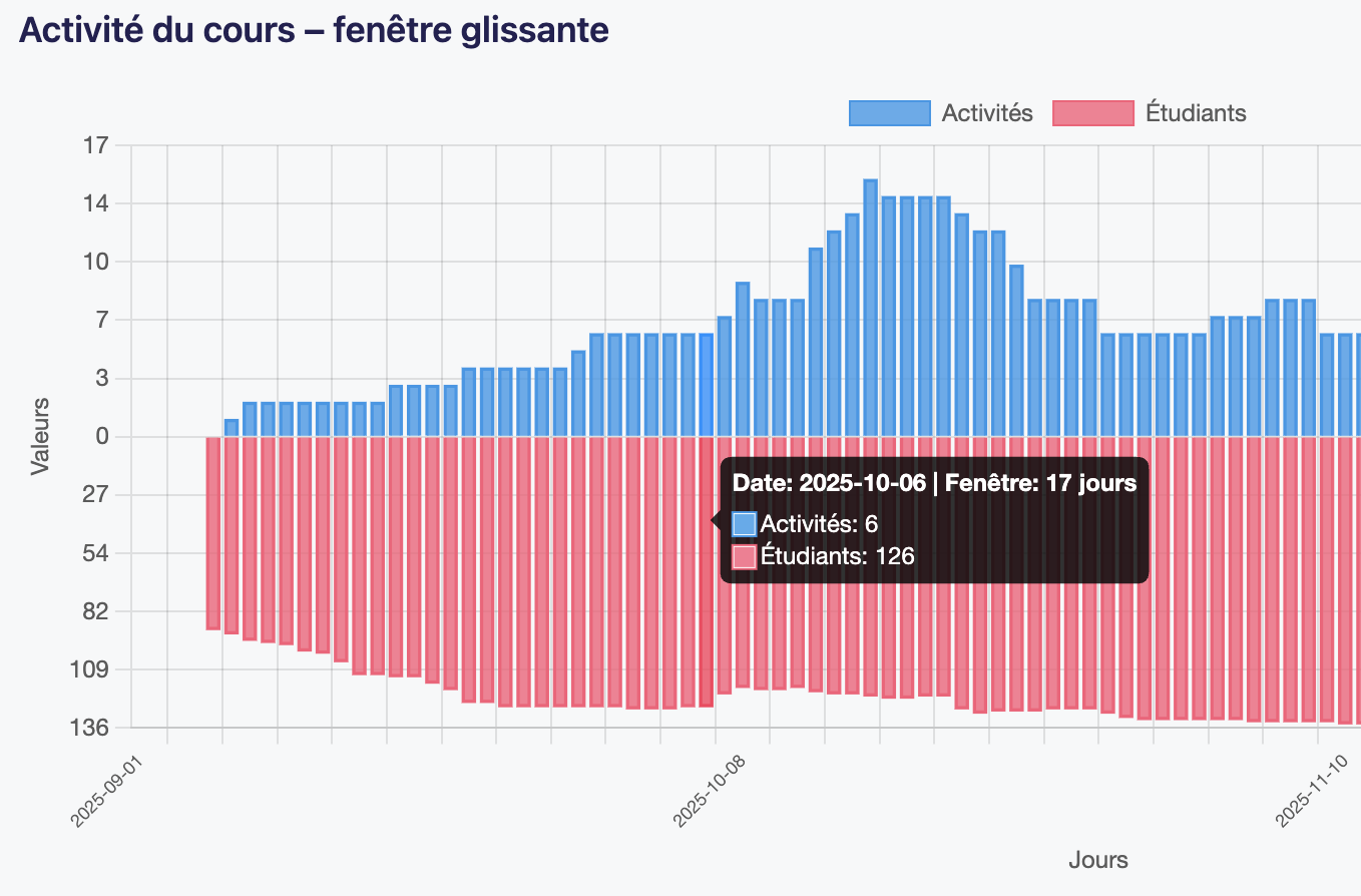 Ce graphique montre l'évolution de la fenêtre flottante au fil du temps. Elle indique le nombre d'actions de la fenêtre flottante dans sa partie haute en bleu et le nombre d'étudiants actifs sur cette fenêtre flottante en partie basse en rouge.