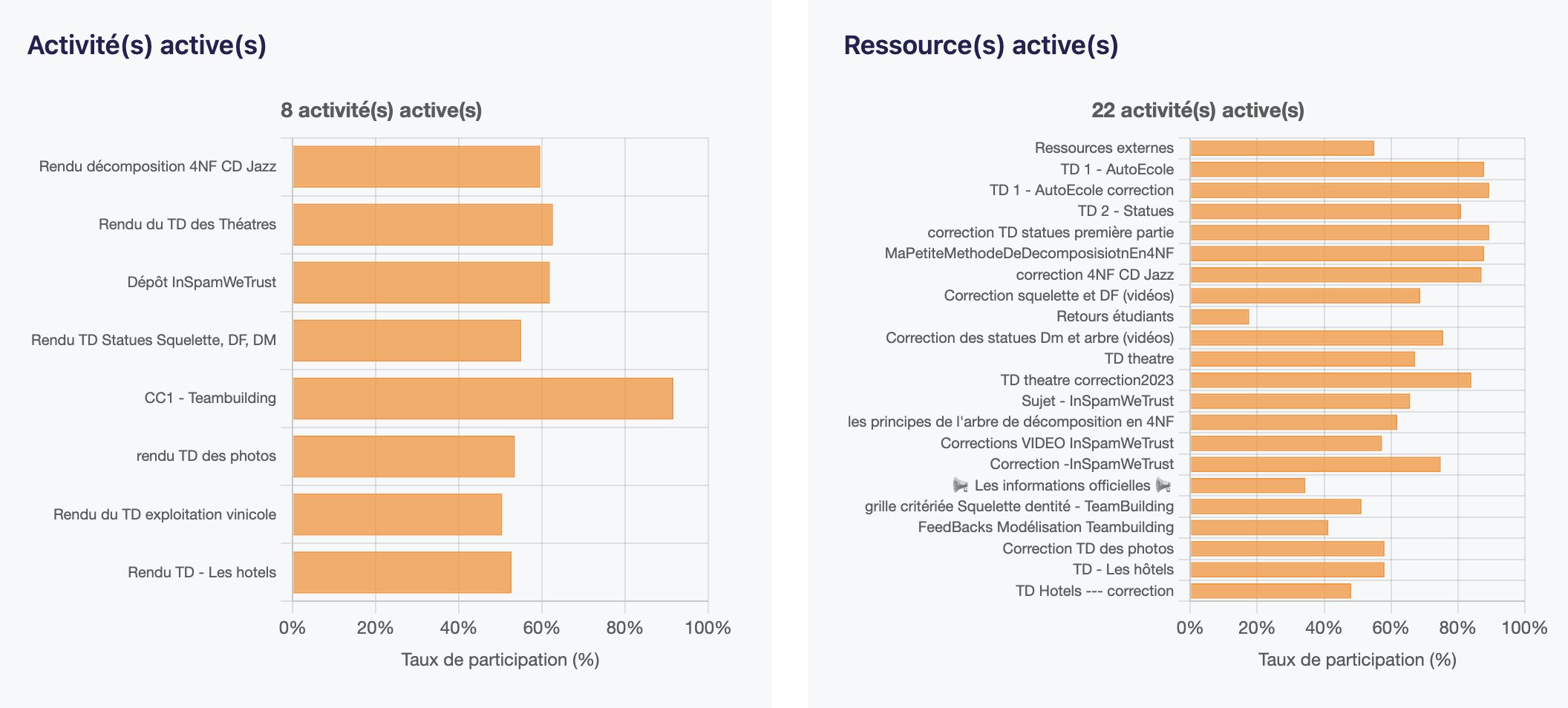 Ces deux graphiques indiquent le taux d'activation actuel de chacune des ressources ou activités. C'est une vue détaillée de la dernière colonne du graphique Évolution du taux de participation par actions. En cliquant, sur l'activité ou la ressource, vous êtes redirigé vers celle-ci sur Moodle.