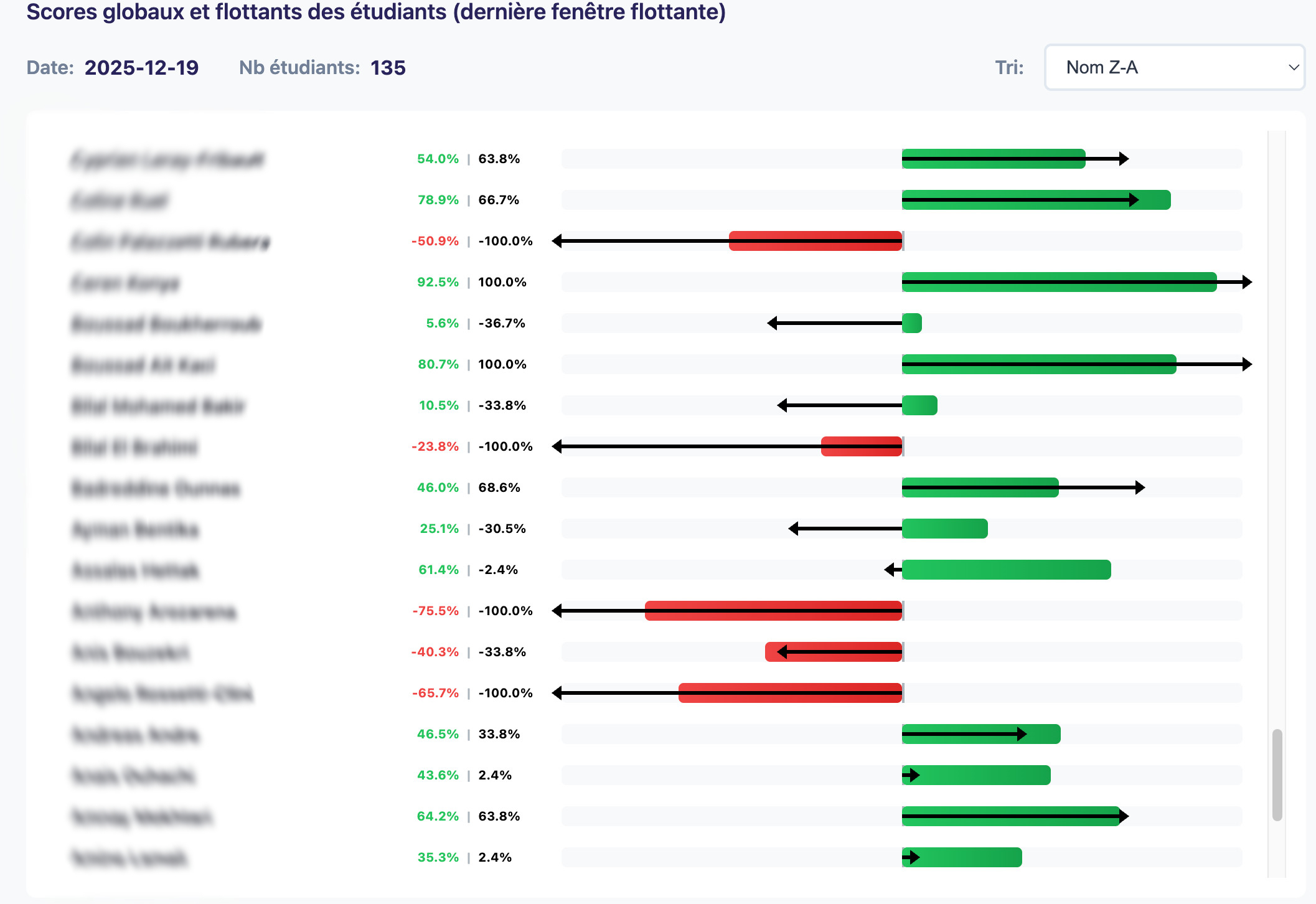 - 0% indique qu'il n'a pas fait la moitié de ce qu'a fait la cohorte. Il est représenté graphiquement par une barre rouge à gauche (score négatif) ou verte à droite (score positif) du centre symbolisant le 0