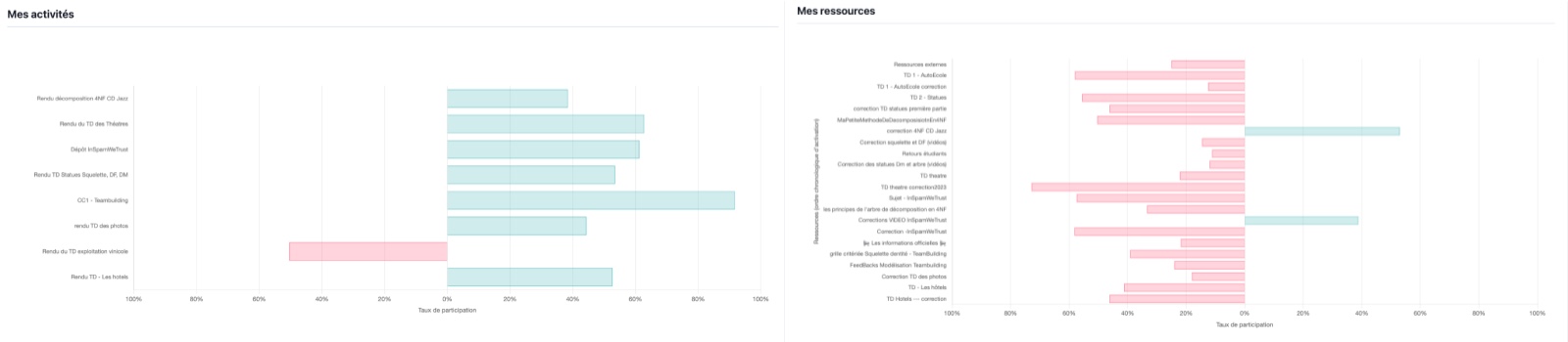 Ces deux graphiques indiquent, activité par activité et ressource par ressource, les actions réalisées par la cohorte et vous.